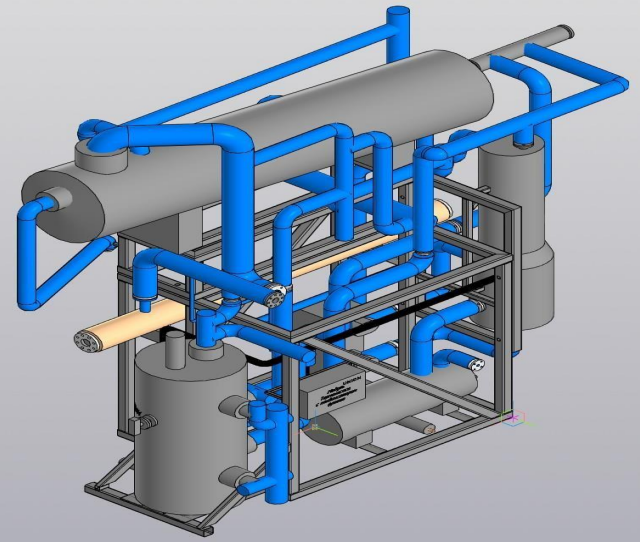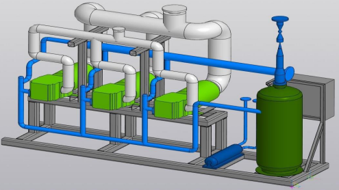 После компрессоров газ проходит через влагоотделитель, охлаждаемый хладагентом, в котором газ охлаждается и вода выделяется в конденсат. Сепаратор воды с коалесцирующим элементом удаляет водный конденсат из газового потока.